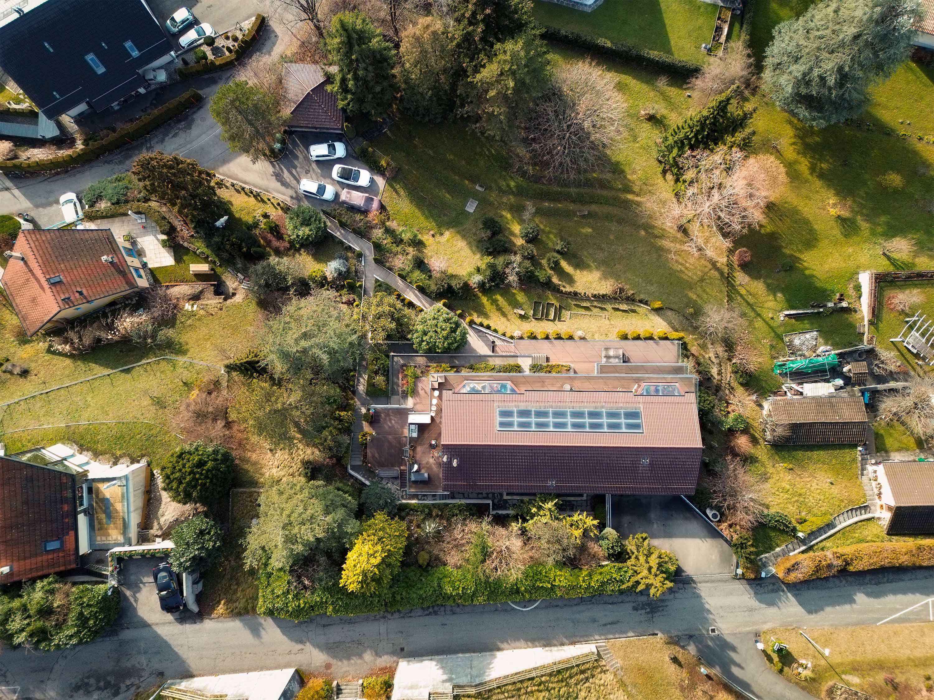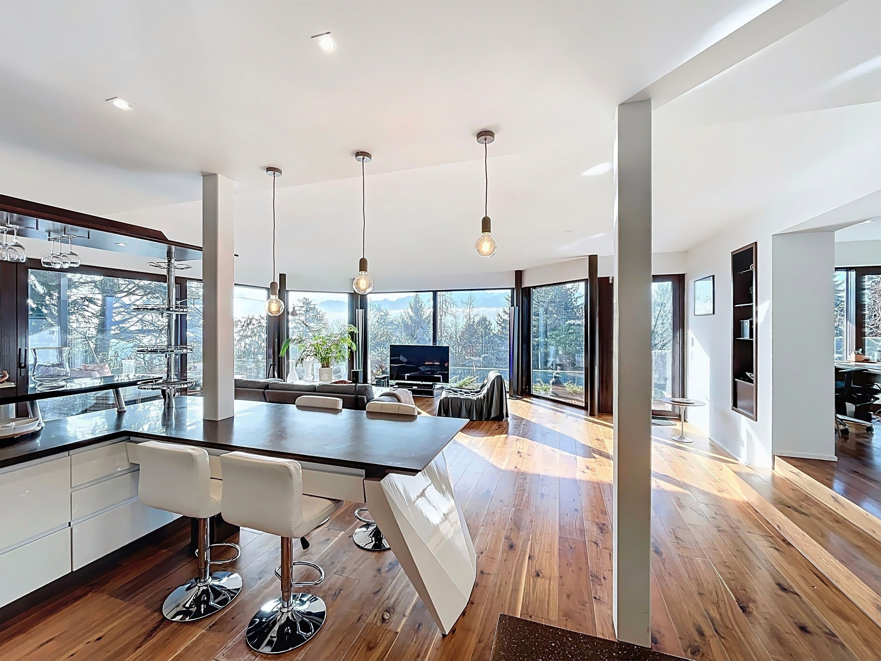 Développant une surface utile de 449 m², dont 355 m² habitables, cette propriété de 9.5 pièces séduit par ses volumes généreux, sa luminosité et ses 229 m² de terrasses au total, offrant une parfaite continuité entre intérieur et extérieur.
